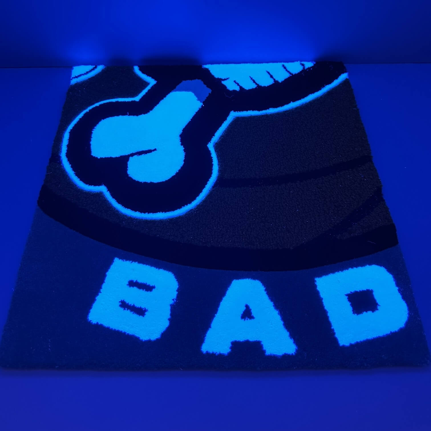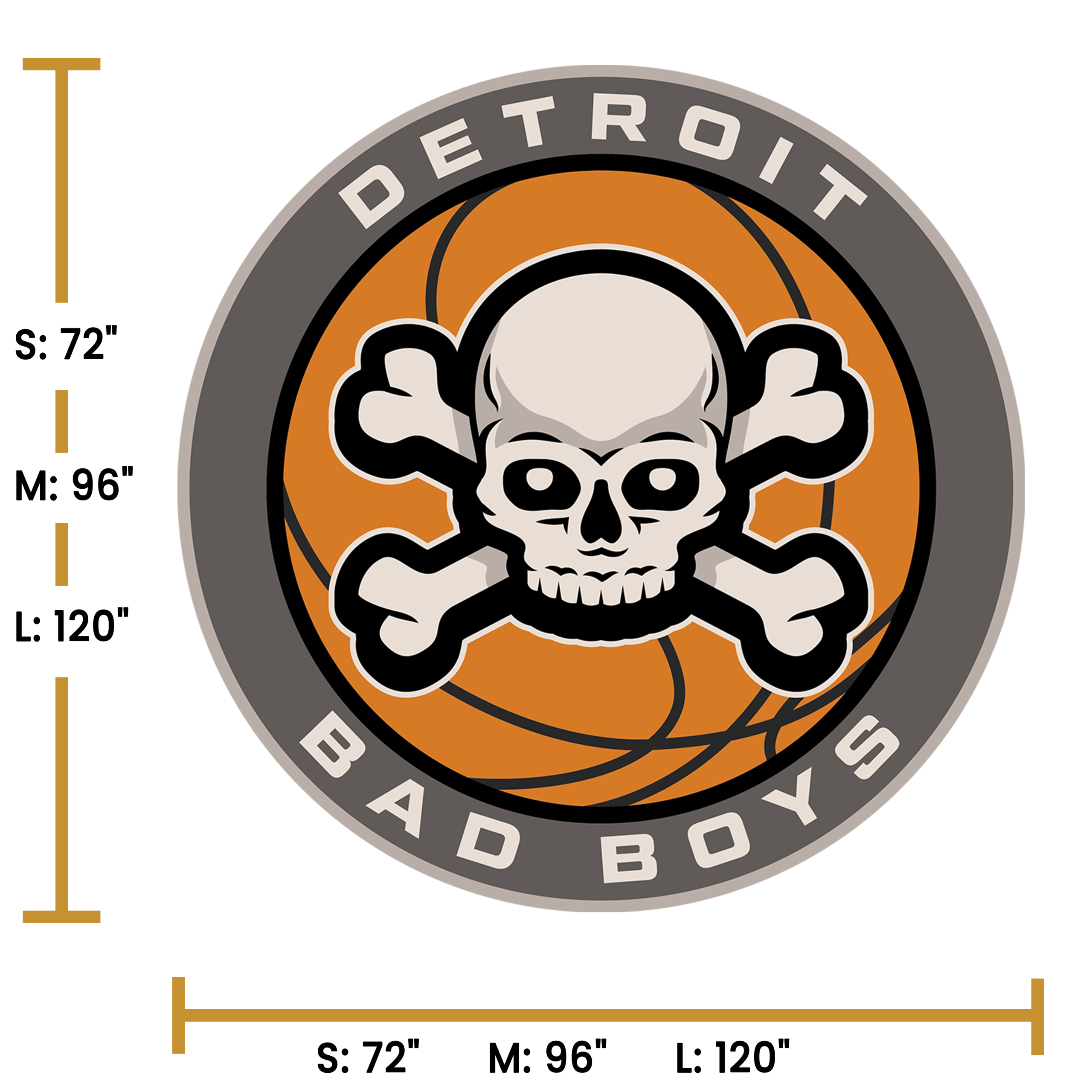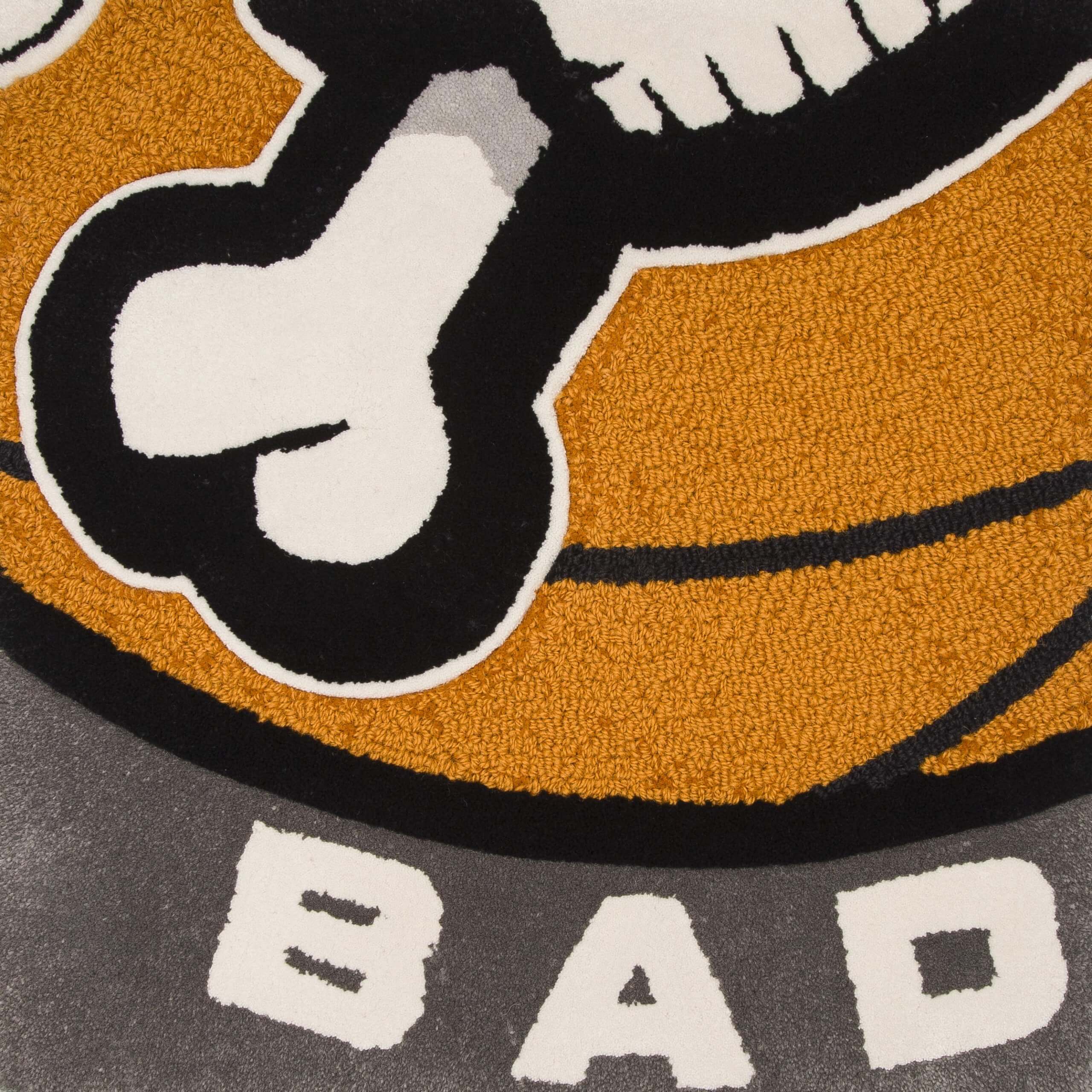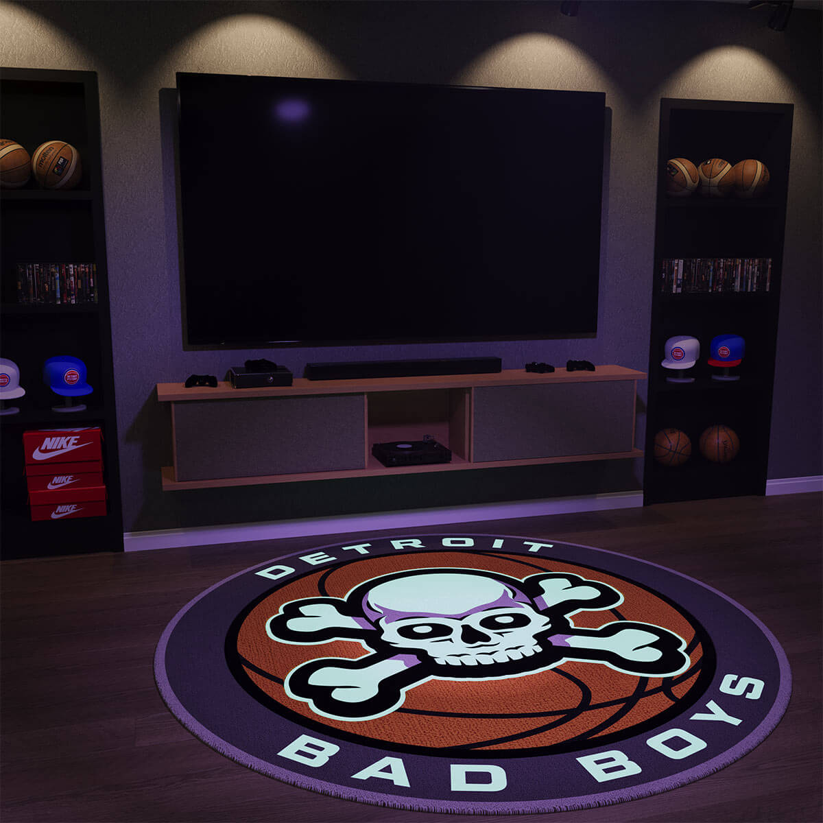 The Bad Boys Basketball. This rug was inspired by the most feared defense the NBA has ever seen. The skull and crossbones and basketball perimeter are carved giving the rug a 3D effect. The letters and skull and crossbones features our special UV glow yarn. Under a UV light the white yarn will come to life in a breathtaking display. This robo-tufted rug is available in 3 sizes and also can be scaled to fit your room.